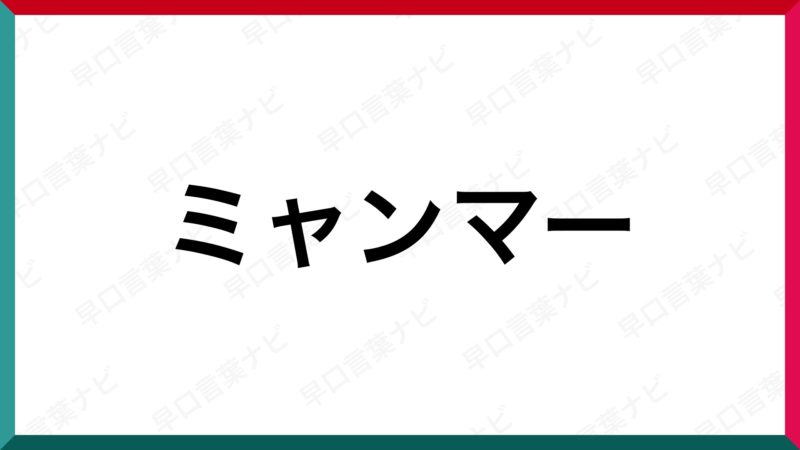 ミャンマーのマナー・言葉・会話 楽しい旅行を満喫するために! 海外旅行をご経験の方は、突然のトラブルに出くわしたことはありませんか??その原因の多くは、その国の、法律やマナーの違いを理解していなかったという点が挙げられます。 渡航する前に、少しでもミャンマーのマナー ミャンマー連邦共和国(ミャンマーれんぽうきょうわこく、ビルマ語 ပြည်ထောင်စု သမ္မတ မြန်မာနိုင်ငံတော် 、英語 Republic of the Union of Myanmar )、通称ミャンマーは、東南アジアのインドシナ半島西部に位置する共和制 国家。 ミャンマー、ミャンマー、3ミャンマー、 合わせてミャンマー、6ミャンマー 高速③回 15年10月 3日 ・ 舌の回転チェック! 早口言葉 ケントの早口ことば〜 今回のお題はこちら 前回に引き続き、漁港シリーズ! 三崎漁港(みさきぎょこう) 超高速⑤回